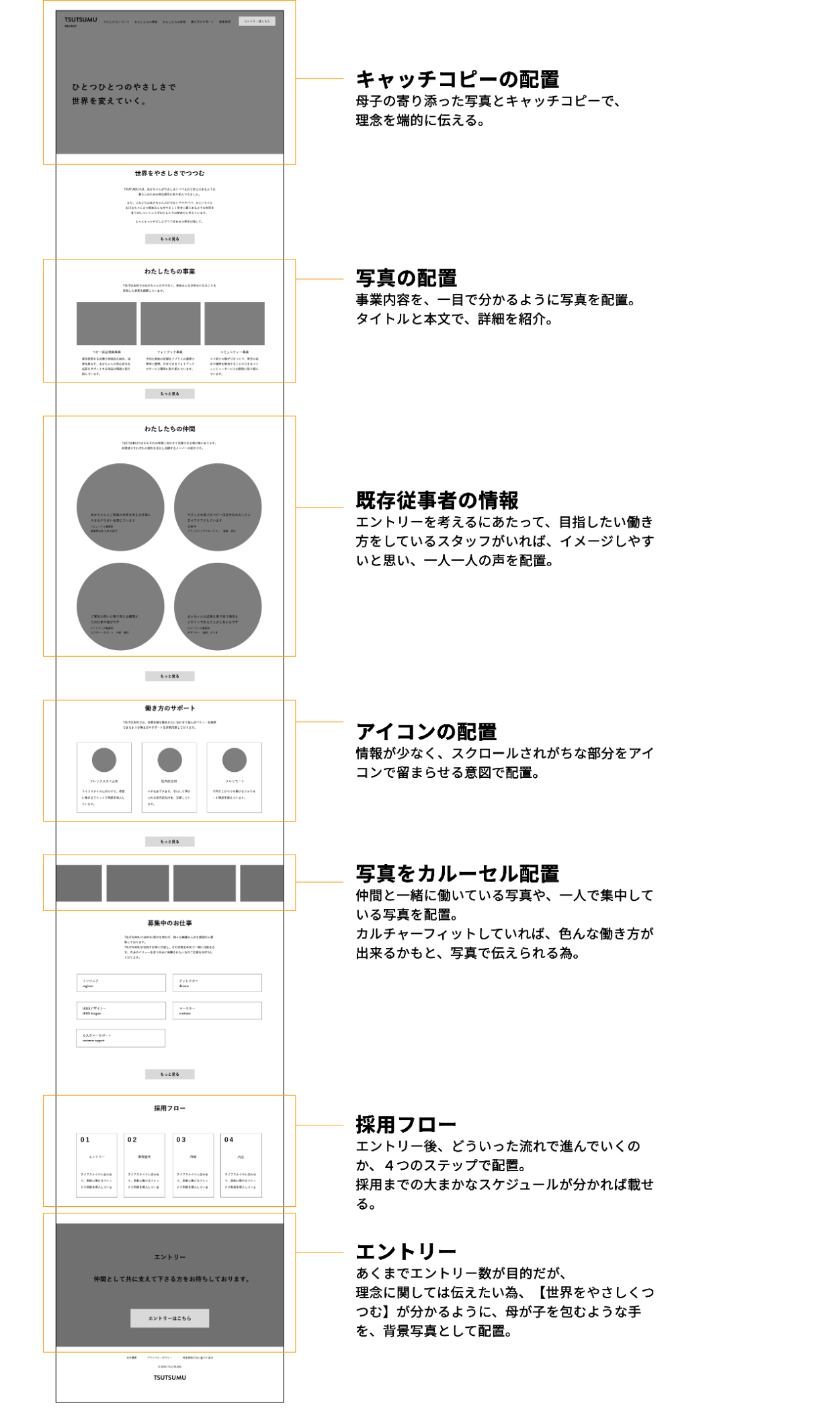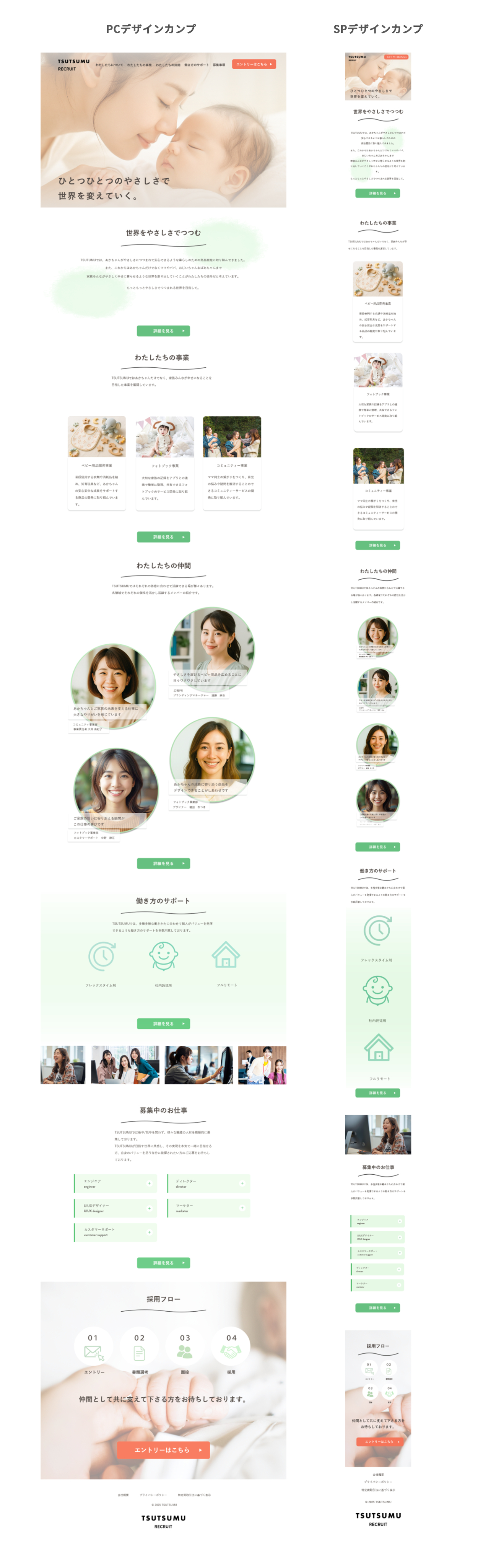柔らかい色味や余白の取り方、丸みのある要素を意識し、採用に関するセクションに関しては、かっちり見える様に工夫しました。