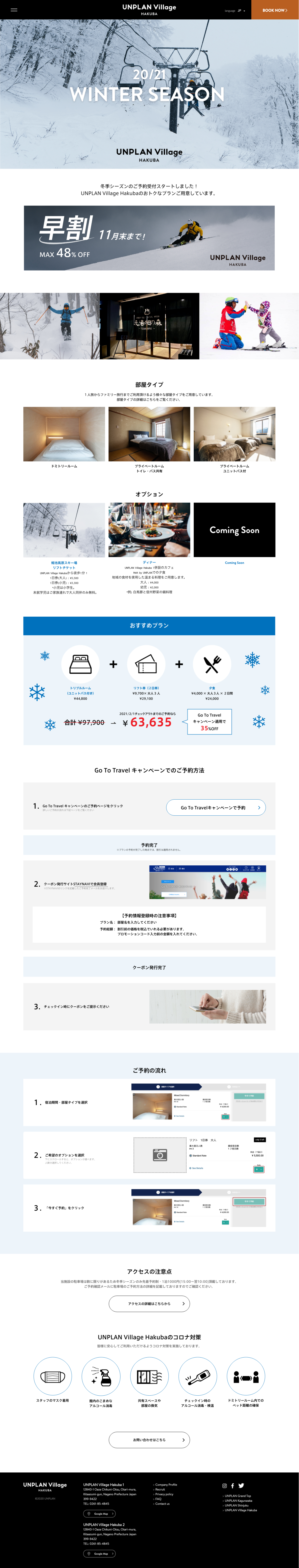 特設ページ制作 - UNPLAN白馬様- 山本 瑚々 Webデザイナー OVERVIEW 冬シーズン限定の特設ページデザインを担当しました。 YEAR 2020 〇制作時期:2020年12月〇概要:冬シーズン限定の特設ページのデザインを制作しました。冬をイメージし、青色を基調としたデザインに仕上げました。〇使用ソフト:XD,illustrator〇制作期間:7日 WEBSITE