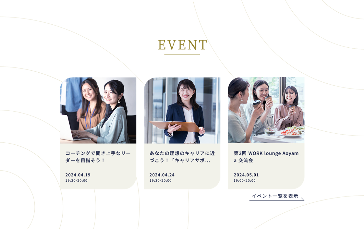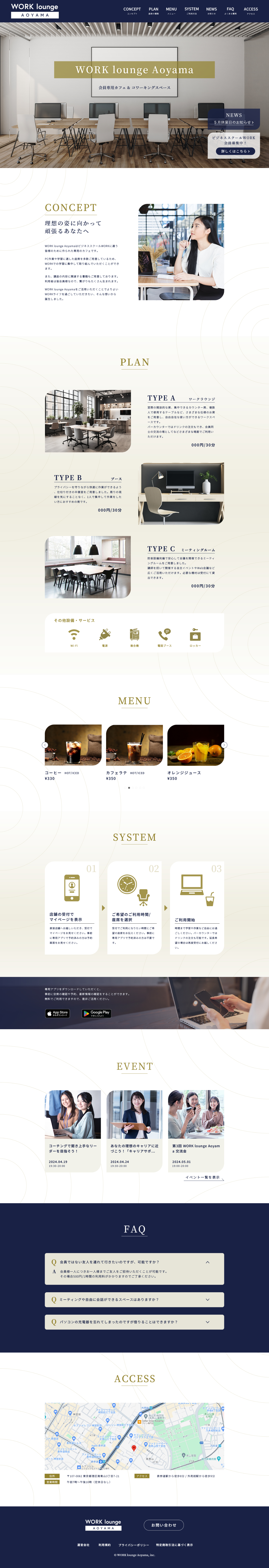 ご指摘を受け、いくつかサイトを確認し、ニュースがトップページに記載されているパターンが多いことに気が付きました。また、LPの目的である認知拡大に気を取られ、コワーキングスペースの運用という観点が欠落していたことに気づくことができました。そのため、「NEWS」のセクションを「EVENT」に変更し、ニュースの項目はトップのメインビジュアル内に表示するようにしました。
