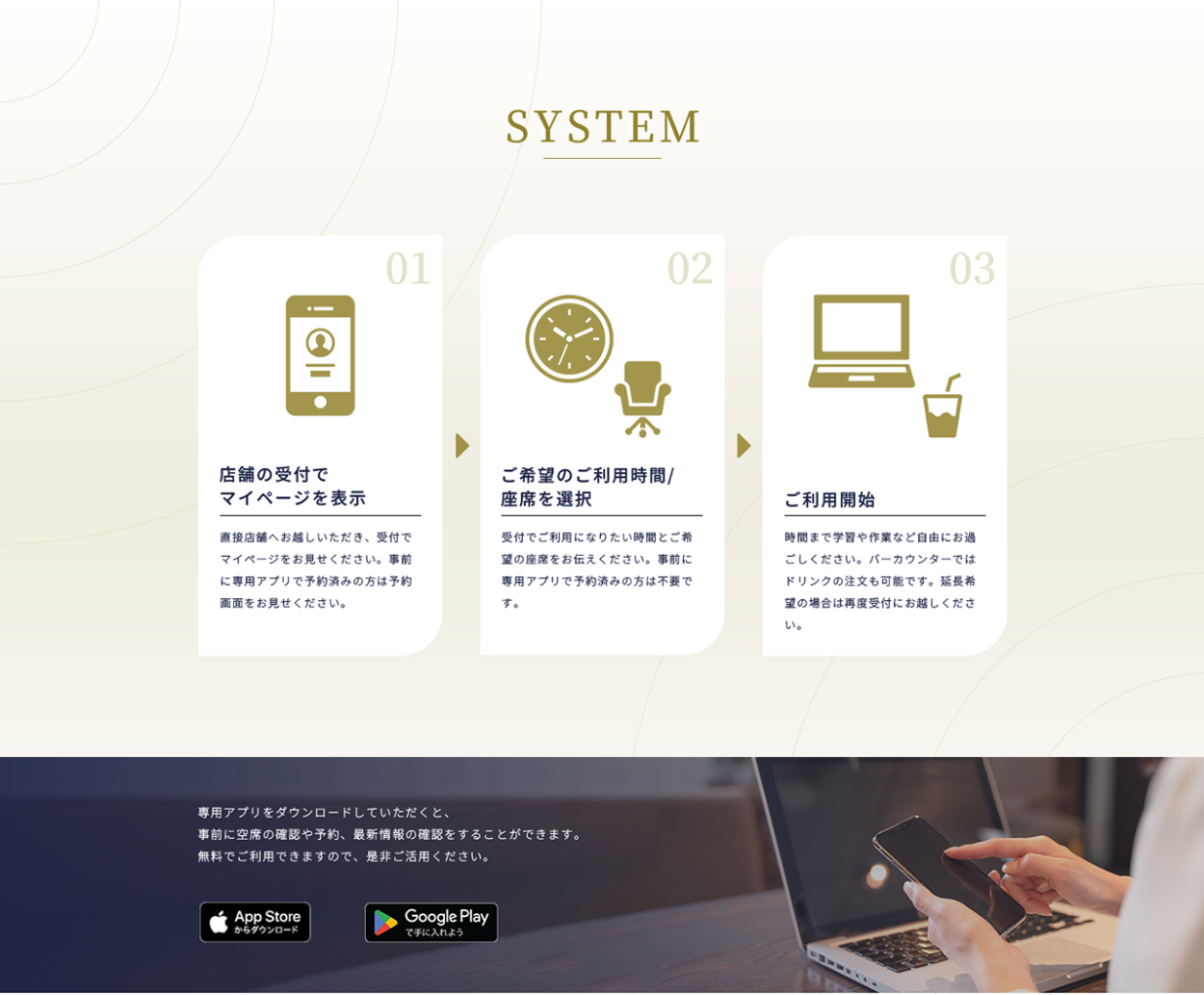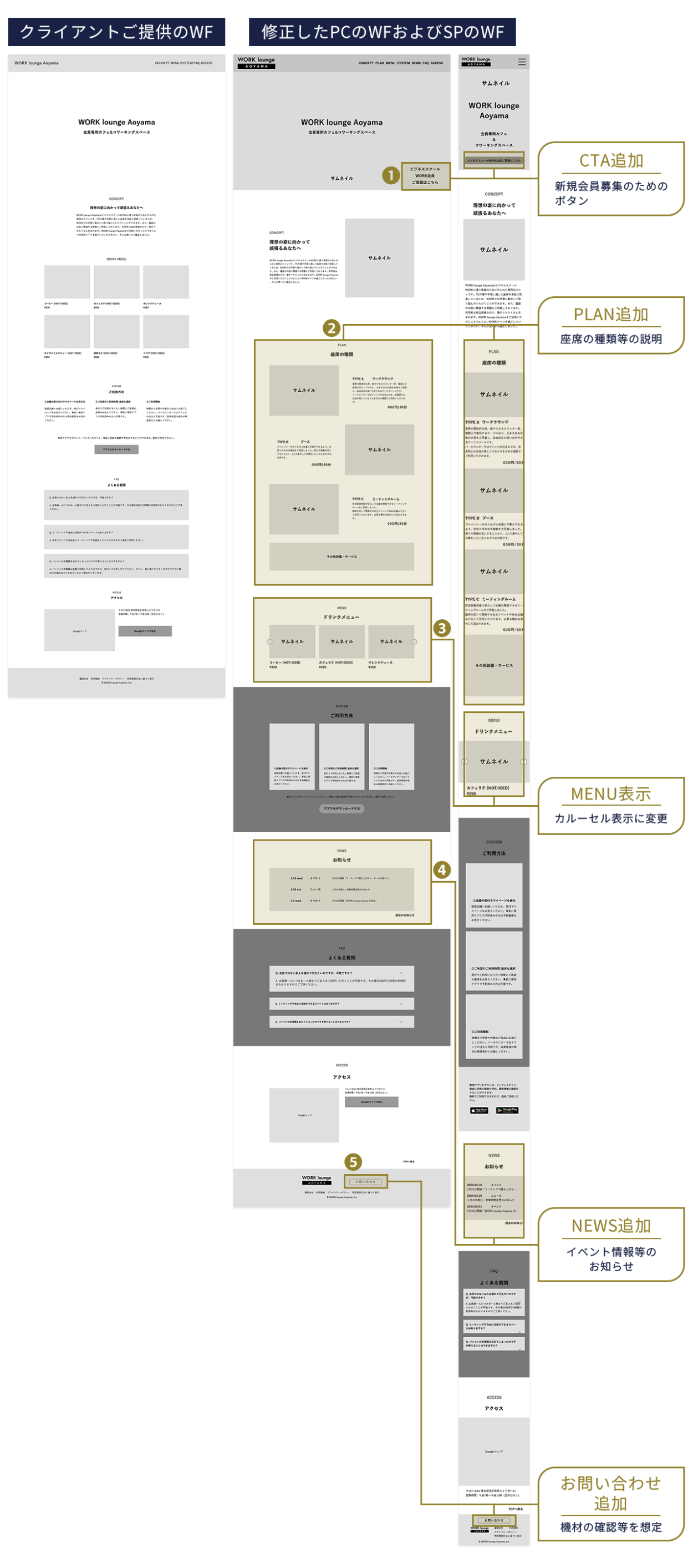 座席の種類と付随するその他サービスを紹介するセクションを追加。MENUの前にPLANのセクションを持ってきたのは、ペルソナがドリンクメニューよりもどんな座席があるのかを重要視するのではないかと考えたため。