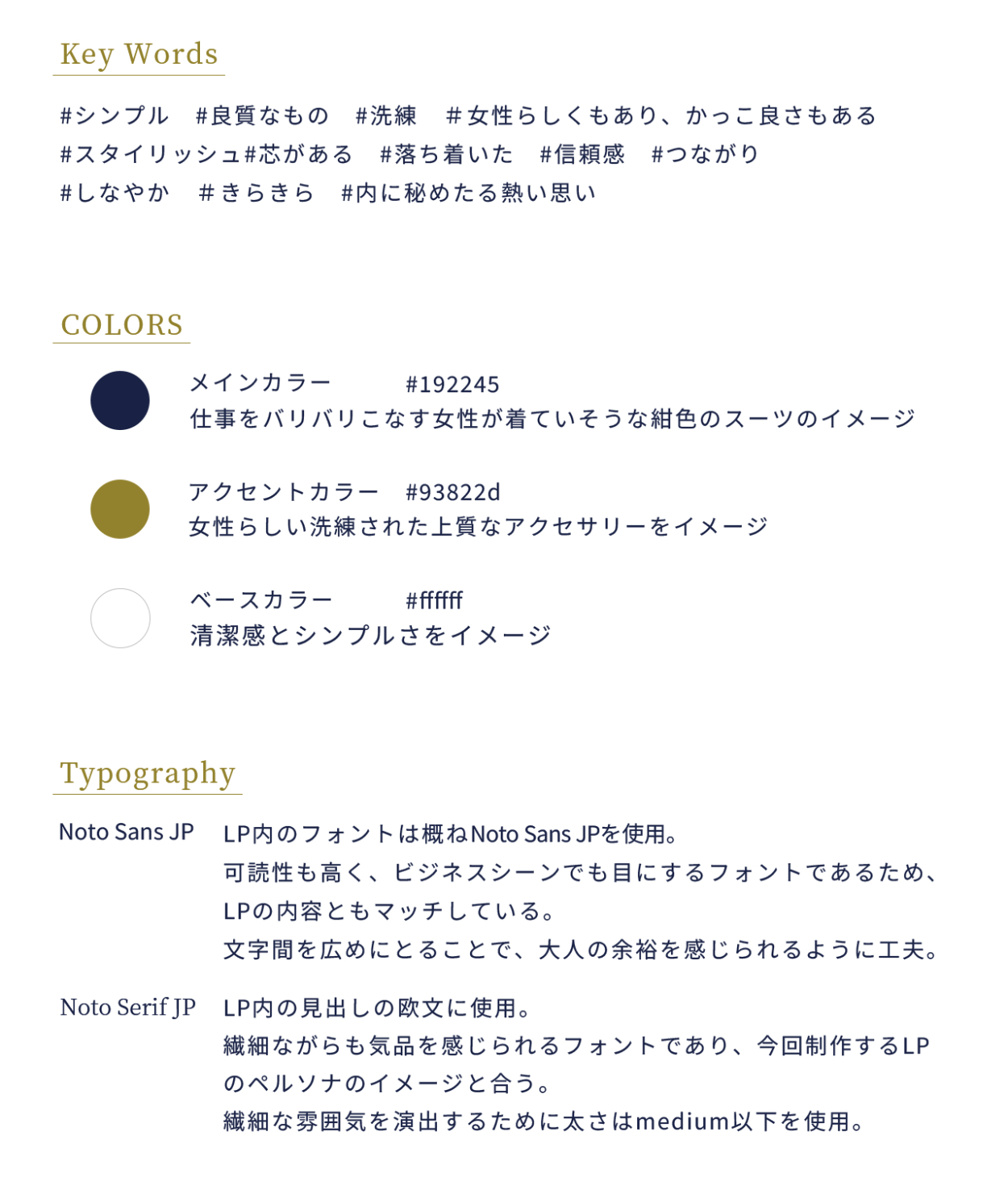 ペルソナおよび課題要件から次の「Key Words」を考えました。シンプルで洗練された雰囲気と女性らしいしなやかさを感じられるデザインを目指しました。