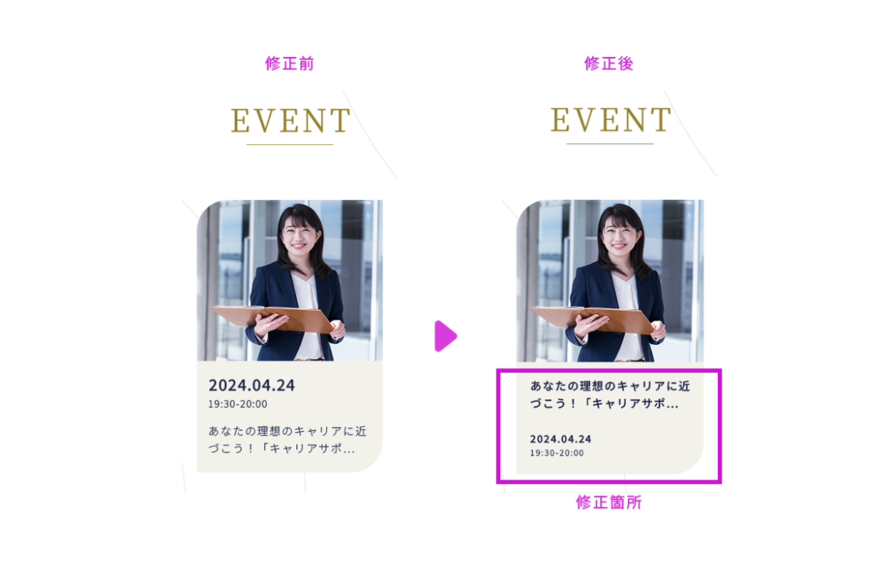 ご指摘を受けて他の事例を調べたところ、イベントタイトルのフォントが目立つものが多いことに気づきました。そのため、イベントタイトルがより目立つようにフォントサイズを大きくし、日時の情報を小さく修正しました。この修正を通じて、情報の優先順位を考える重要性を学びました。