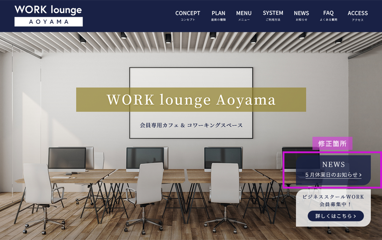 イベント情報(コーチング等)や休業日をお知らせするセクションを設け、コワーキングスペースとしての利用だけでなく、イベントに参加する目的の利用者の増加も狙う。