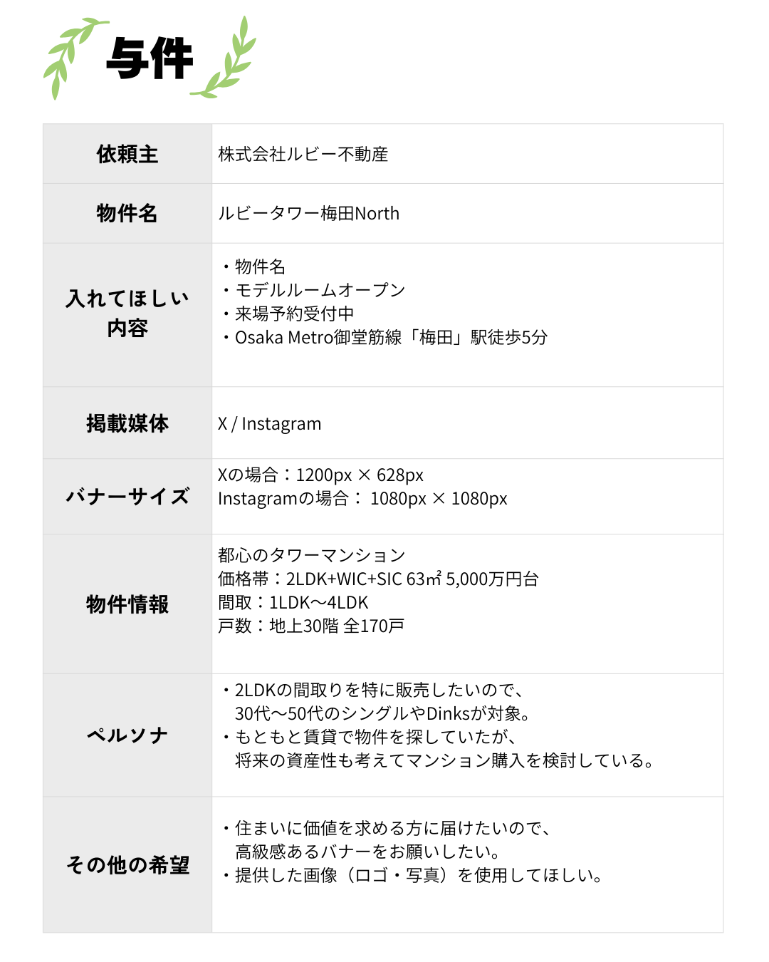 【バナー】分譲マンションモデルルーム(架空案件) hitomi Webデザイナー OVERVIEW Webデザインスクール「HarTech」の課題により、架空の依頼書を元にInstagram用とX用のバナーを制作しました。
