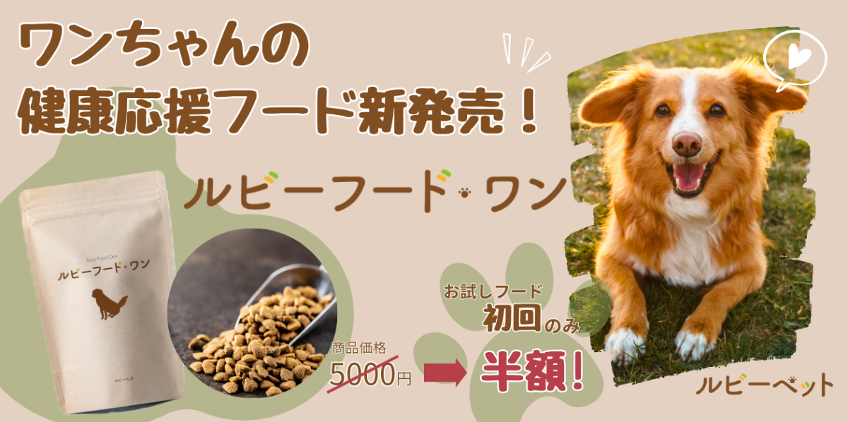 全体的にワンちゃんのように可愛いらしく元気なイメージのバナーを意識して作成いたしました。クライアントが伝えたい愛する愛犬のためにお金を惜しまず買ってくれる方のための『初回半額キャンペーン』この部分をパッと見たとき目に着くようにレイアウトを心掛けました!