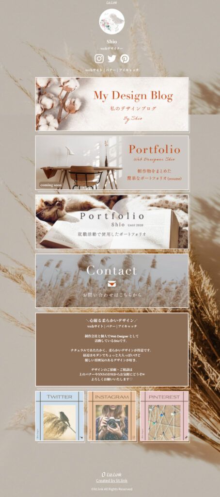 ページ内のバナーは自分でデザインしました。 「モダンでちょっと大人っぽいけど、優しい雰囲気のあるナチュラルなデザイン」がテーマ