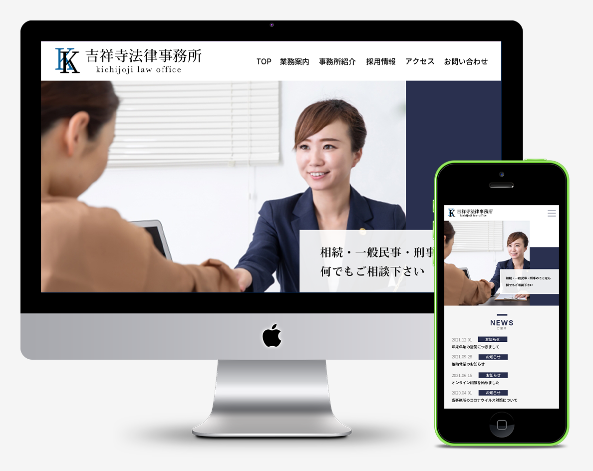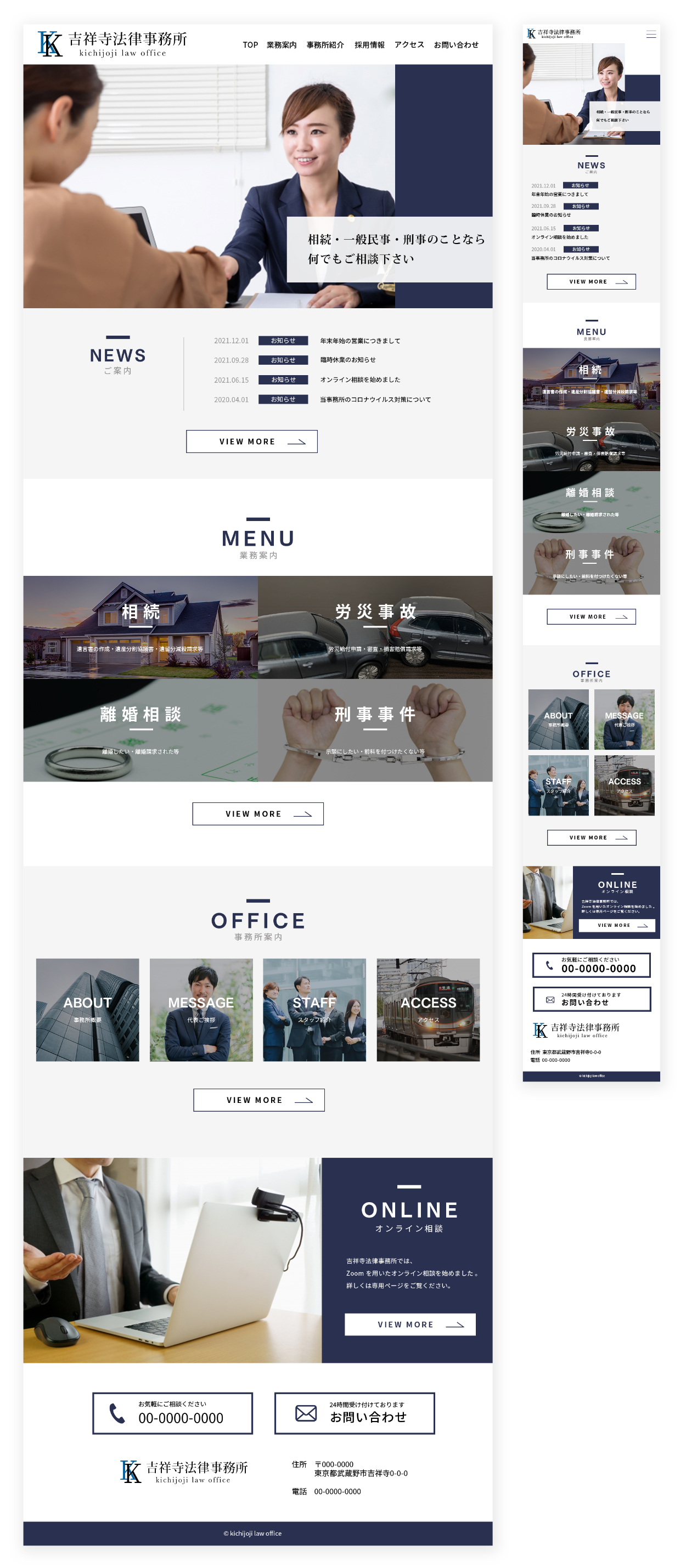 法律事務所の架空サイト shishikura webデザイナー OVERVIEW 架空の法律事務所サイトのデザインを制作しました。 YEAR 2021 落ち着いた雰囲気が出るようにネイビーを使用し、信頼感を与えられるようなデザインにしました。【使用ツール:Photoshop】