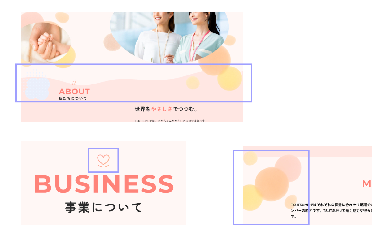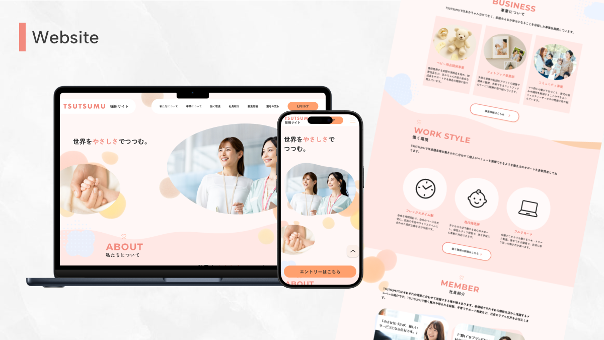 配色・あしらい:ブランドカラーを基調に、包み込むような柔らかさを感じさせる配色やあしらいを取り入れ、サイト全体で「TSUTSUMUらしさ」を意識しました。