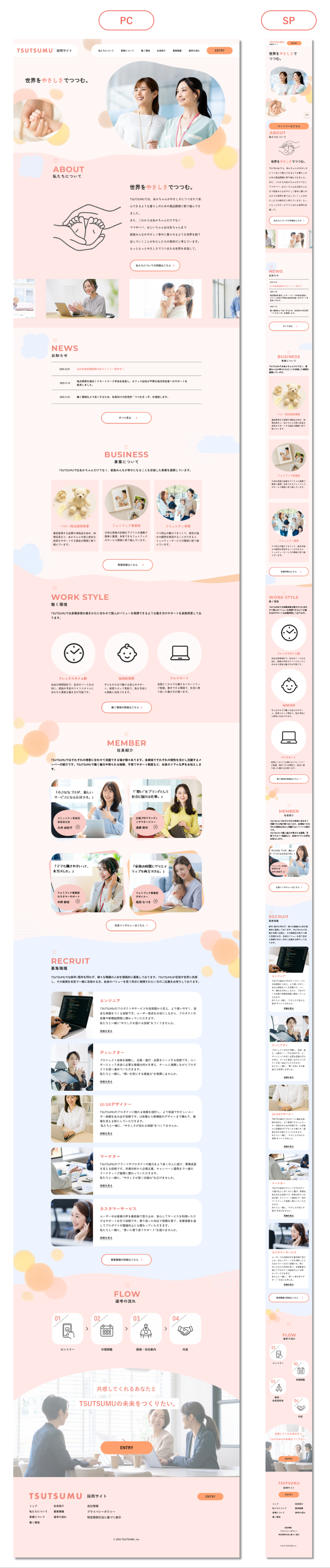 コンテンツの拡張:企業の透明性を高めるため、最新の取り組みを伝える「NEWS」や、入社後のイメージを具体化する「FLOW(選考フロー)」セクションを追加しました。