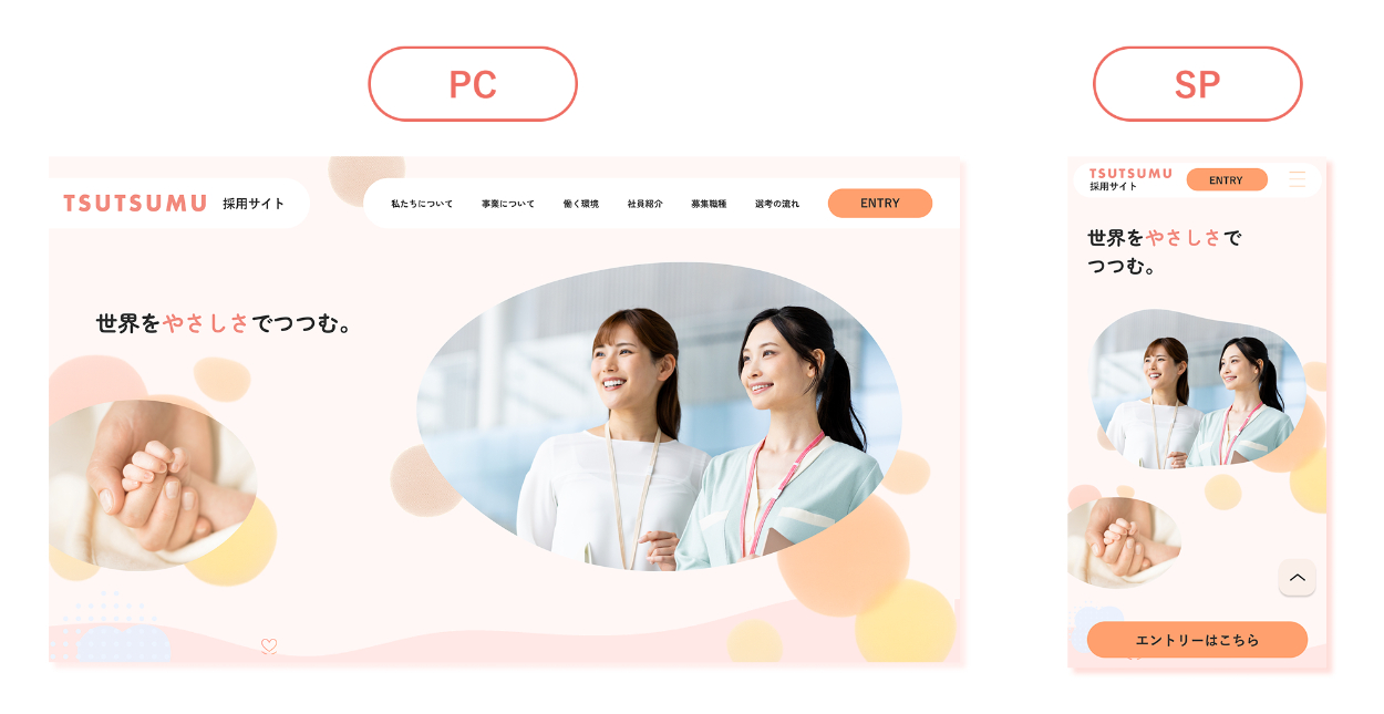 ブランケットをイメージした波状の境界線や、温かみのある水玉・ハートのモチーフを採用 。配色から細部のあしらいまで徹底して「TSUTSUMU」の世界観に一貫性を持たせ、ターゲット層への心理的共感を生むデザインを目指しました 。
