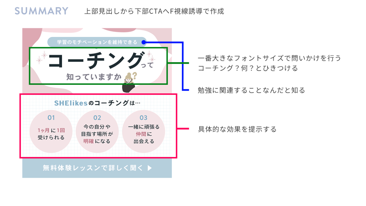 - 引きで見た時の視線誘導としては①コーチング②学習のモチベーションで逆に行ってしまうかと思うのですが、補足情報としてあった方がいいと考え配置しています