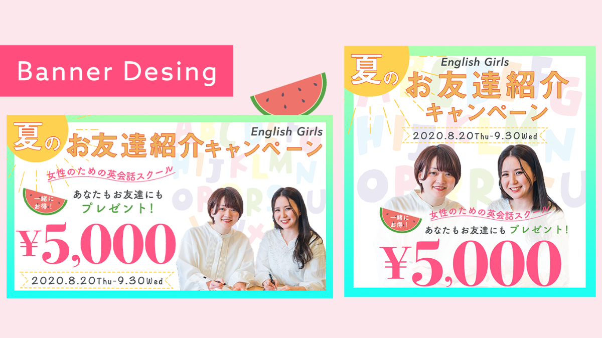 SHEliks MULTI CREATOR PROGECTの課題で、英会話教室のキャンペーンバナー制作に取り組みました。(制作時間:12時間)