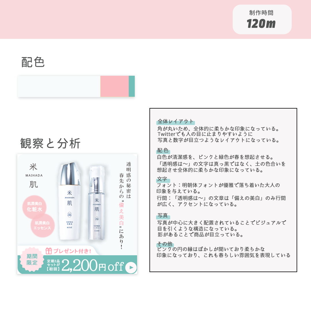 - 配色には春を想起させる色が選択されており、作成者の意図通りか不明なのですが、自分自身がバナーを1から作成する時に考え方として参考にさせていただこうと思いました。
