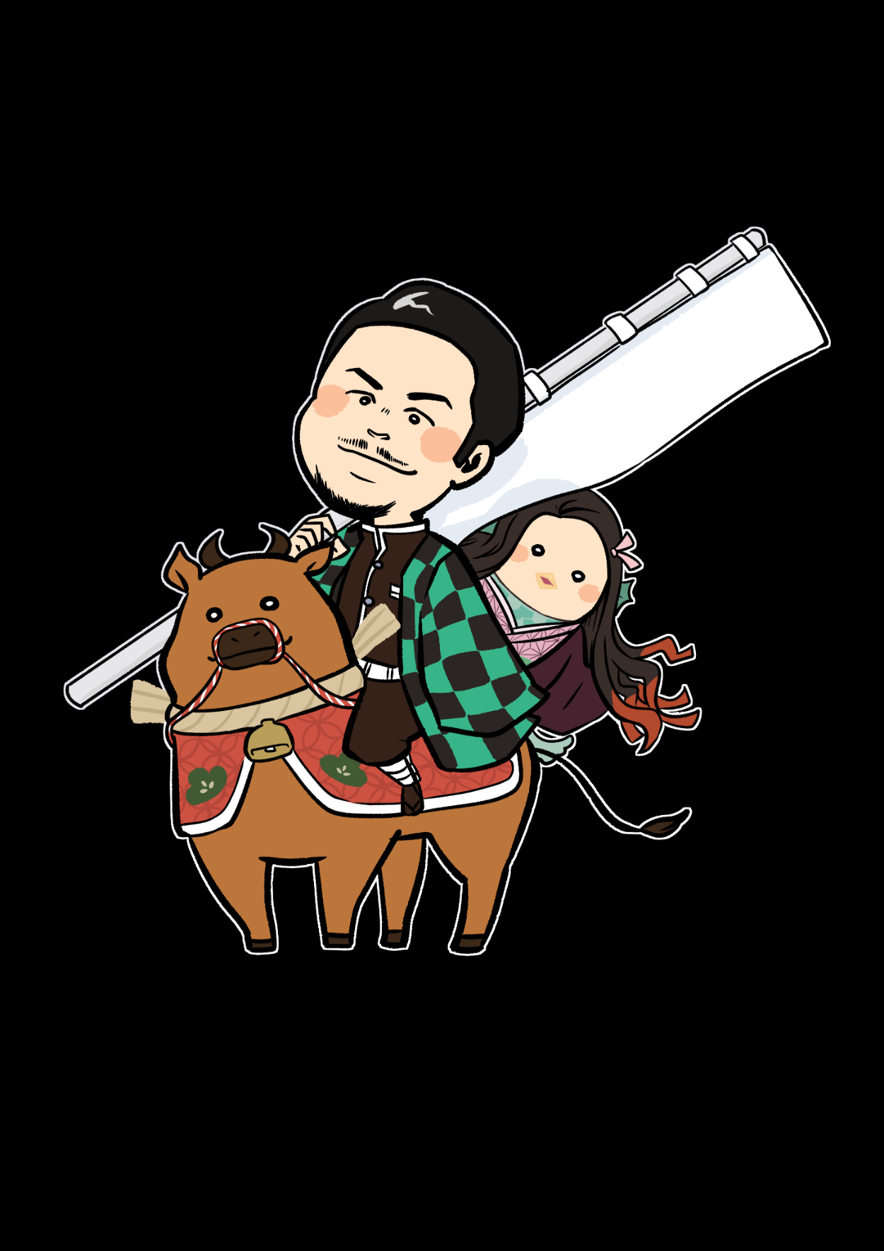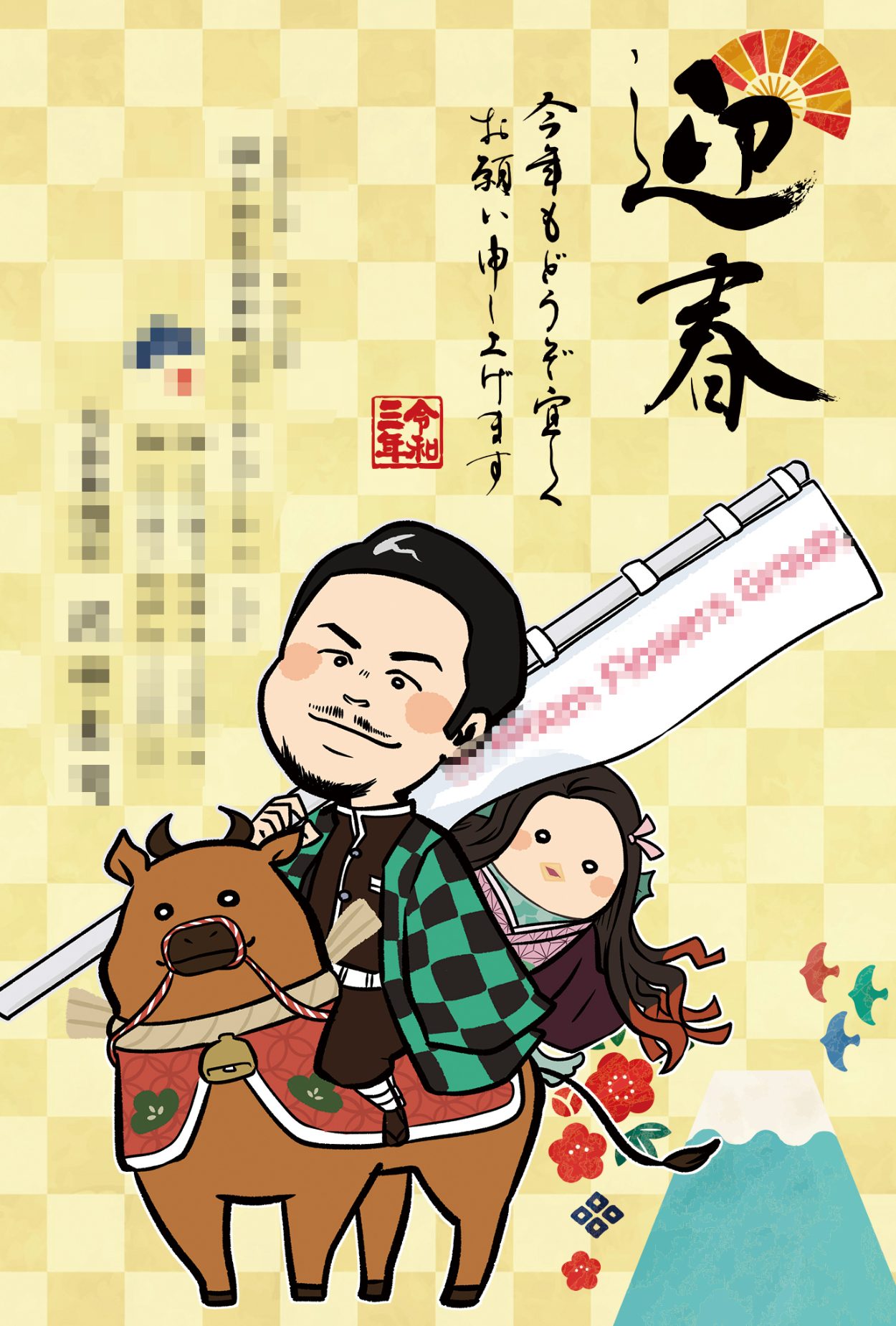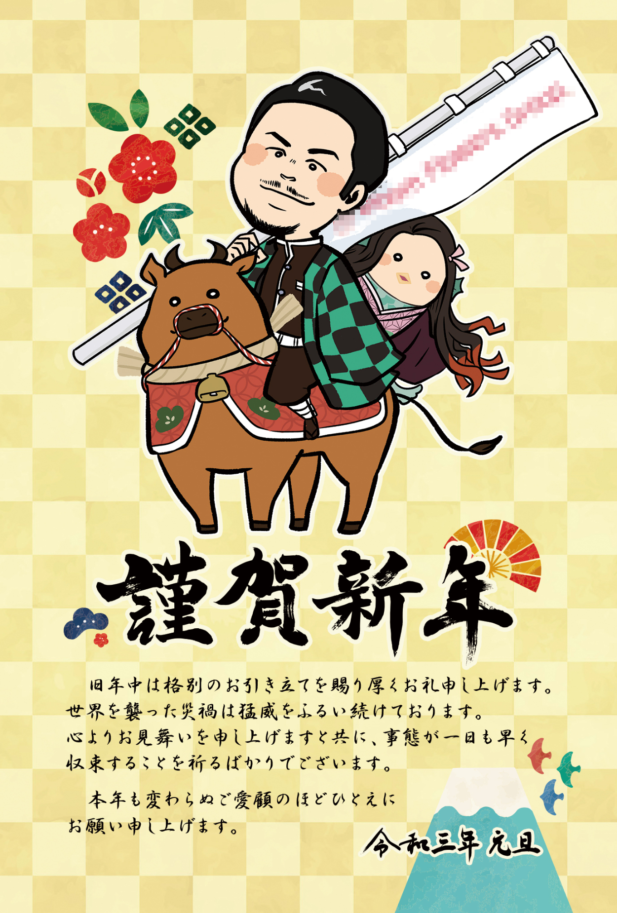 ■要望:アニメ「鬼滅の刃」が流行っていた年のため、社長を「丹次郎化」してほしい。また、コロナが流行った年ということもあり、「禰󠄀豆子 」をアマビエ化したイラストにしてほしい。