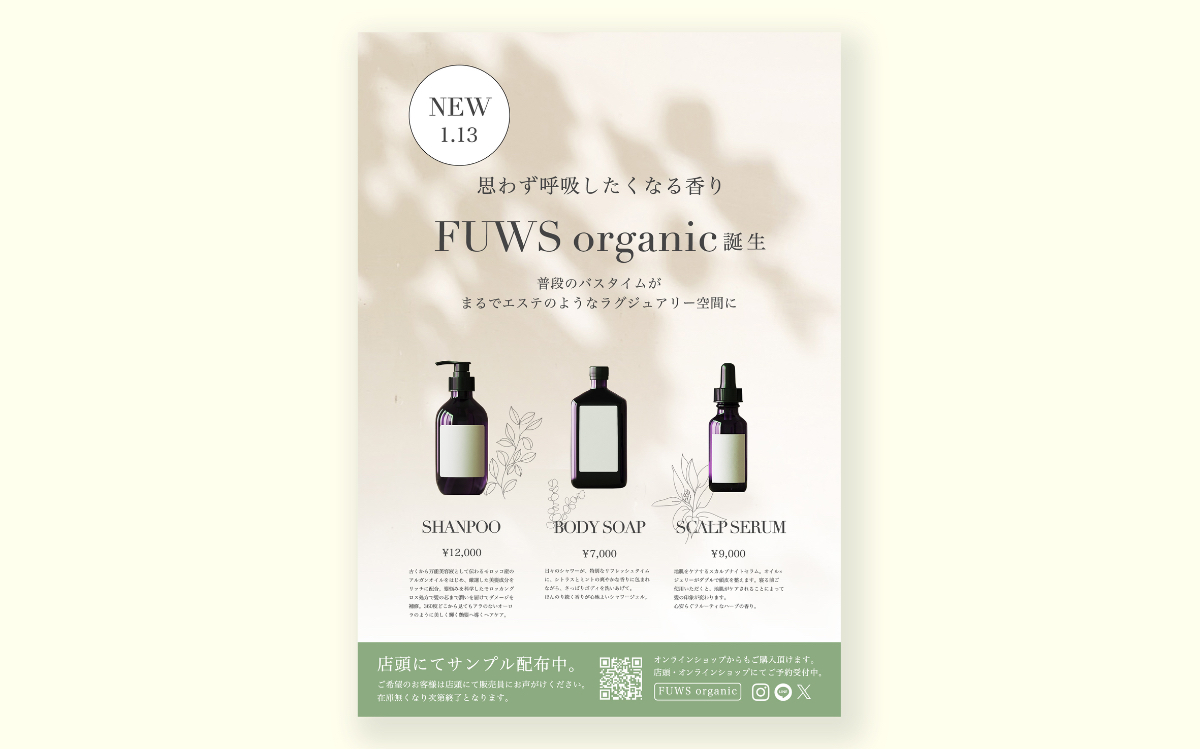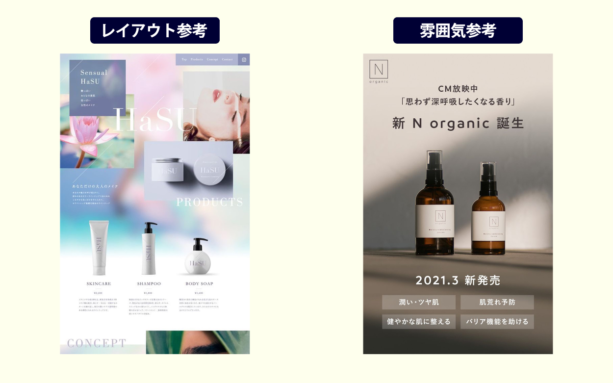 1.ターゲットである30代女性の大人の女性的な印象を表現する為、色数を抑え彩度が低い配色に。書体はモダンで落ち着きのある明朝体・セリフ体を使用しました。また、十分な余白を作ることで大人っぽい印象に仕上げました。