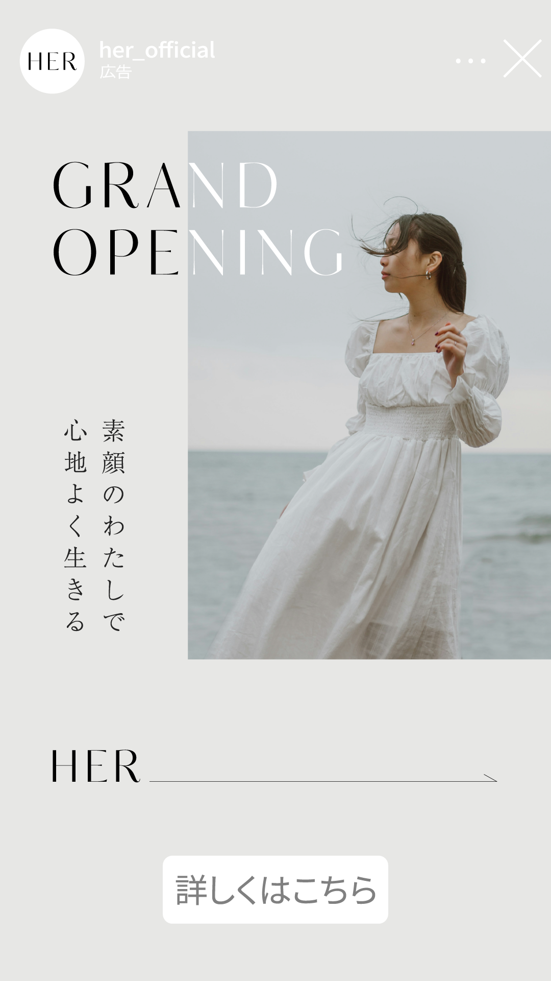 架空アパレルブランド「HER」の新規立ち上げに伴う、Instagramのストーリーズ広告バナーを制作しました。