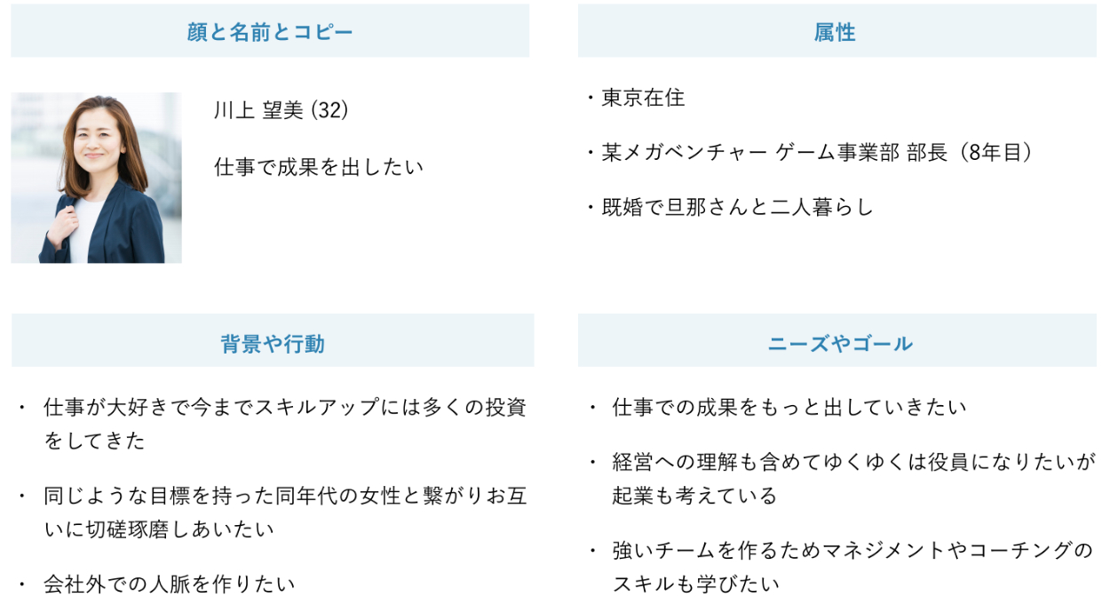 女性向けのビジネススクールを展開している。会員は20〜30代の女性が多く、キャリアアップのためにビジネススキルを学び、さらにそのアウトプットの場として定期的にビジネスコンテストなどのイベントも開催されている。