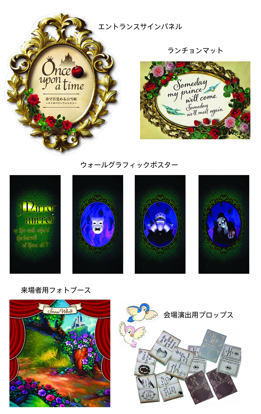 「日常を忘れる、物語への没入体験を。」というコンセプトを軸に、開催ごとに異なる多様なテーマ(「白雪姫」などの童話や季節のコンセプト)に合わせ、会場全体の世界観を構築するグラフィック一式を制作しています。