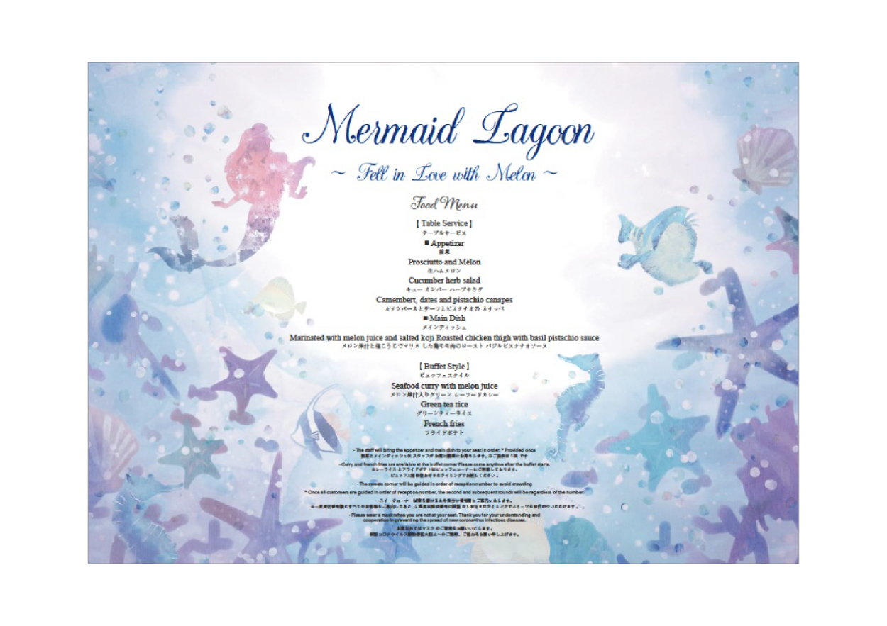 本作は「人魚姫」をモチーフにした回で、メニューも兼ねたランチョンペーパーとして、ご来場のお客様がテーマの世界観により深く没入できるようデザインしました。