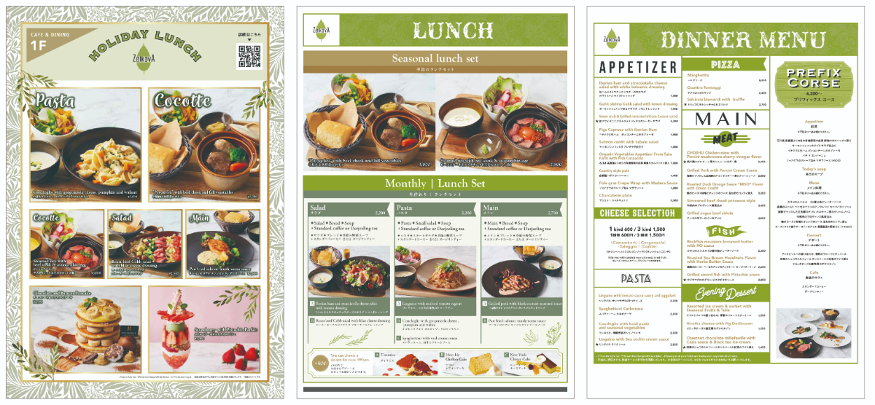 「カフェ&ダイニング ゼルコヴァ」メニュー各種