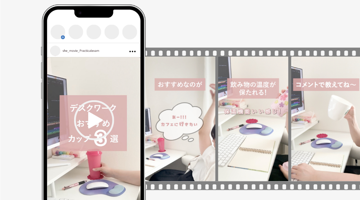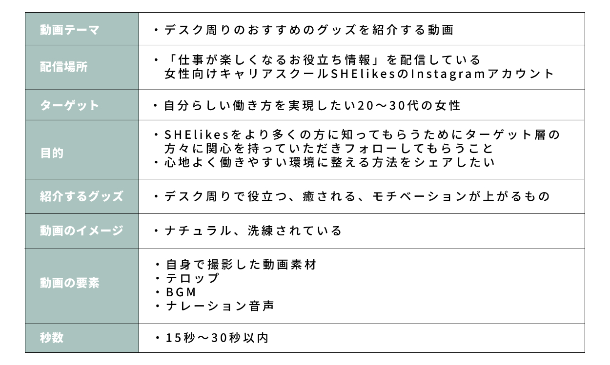 女性向けキャリアスクールSHElikesの動画コースにおける実技試験として、「SNS動画制作」に取り組みました。デスク周りで使えるおすすめグッズを、テンポよく紹介する構成の動画に仕上げました。