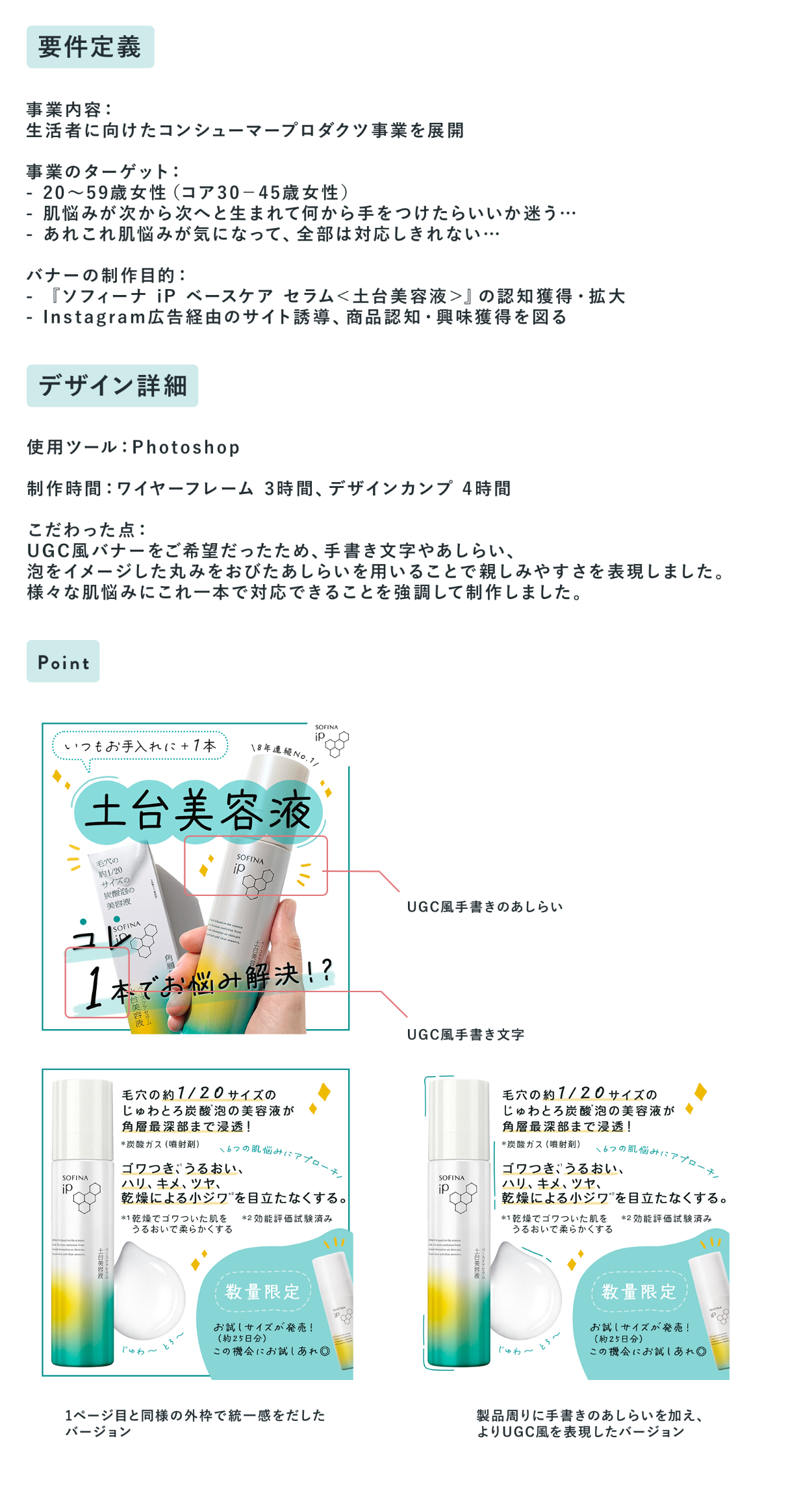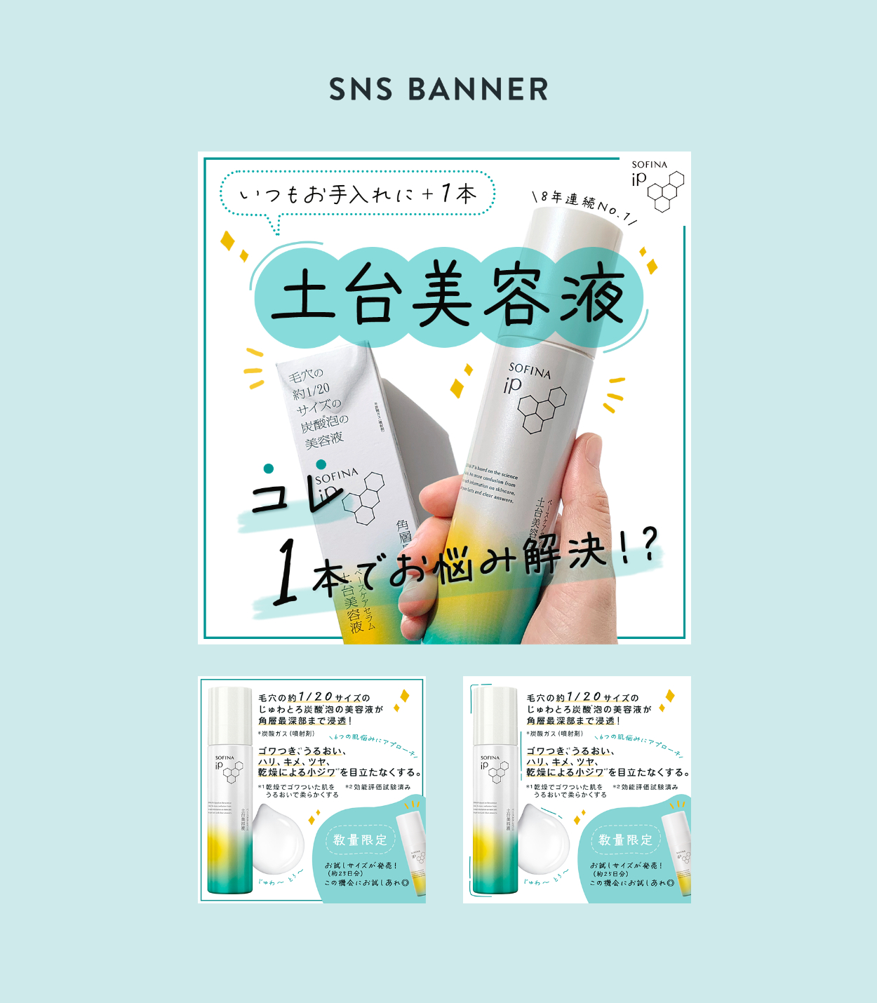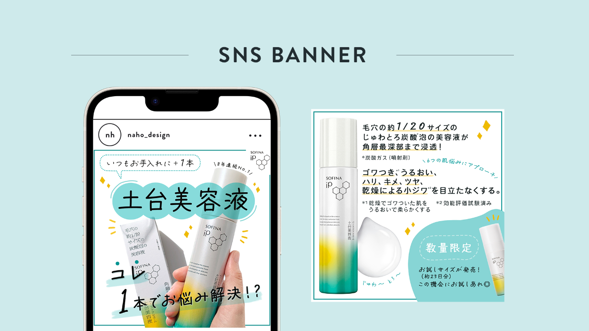 オリジナル Instagram用画像 南帆 フリーランスWebデザイナー・動画クリエイター OVERVIEW 自主制作のInstagram投稿用画像です。(花王様のアカウントを想定して制作しています) 製品名:花王 ソフィーナiP土台美容液