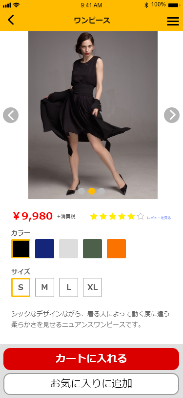 テーマは、アパレルECサイトのカート投入画面のUI作成です。メインビジュアルで着用シーンを複数見せ、それを際立たせるため価格などそれ以外の情報を抑えめにしシンプルにまとめました。ネット通販だからこそ気になる、購入者のレビュー評価は大事なポイントなのでメインビジュアル下に配置。カートボタンとお気に入りボタンは下にスクロールすると追従する想定です。