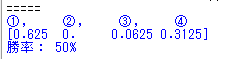また互いに最適な出し方をした時の勝率と最適な手の出し方は標準出力にも出力されます。