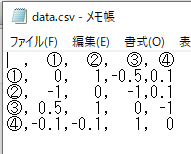 入力ファイルは勝ち負けの重みをcsv形式で表にしたものを用います。