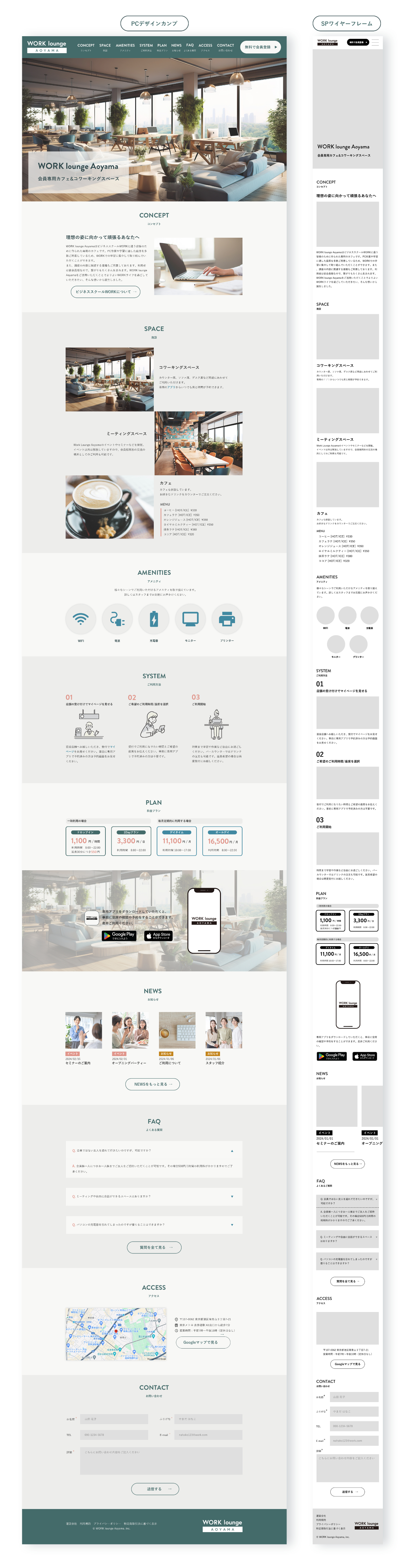 SHElikes MULTI CREATOR COURSE Designerの課題として、架空クライアントのカフェ&コワーキングスペースのLPを制作しました。目的達成のための情報設計をし、ビジュアルデザインに落とし込みました。