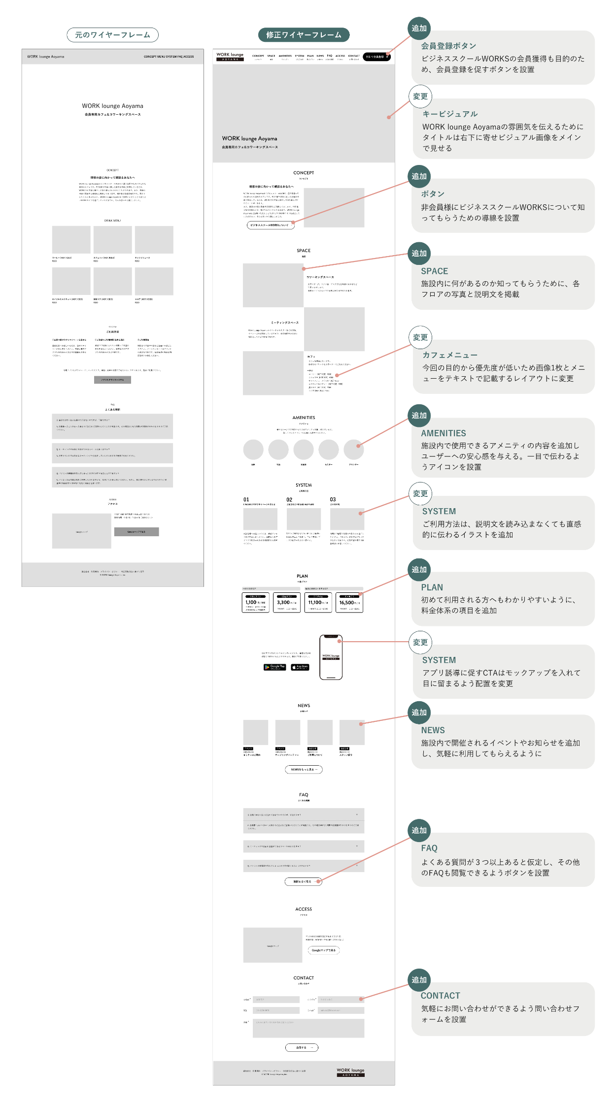 組み立てたユーザーストーリーから、ワイヤーフレームを見直しコンテンツを追加&変更していきました。
