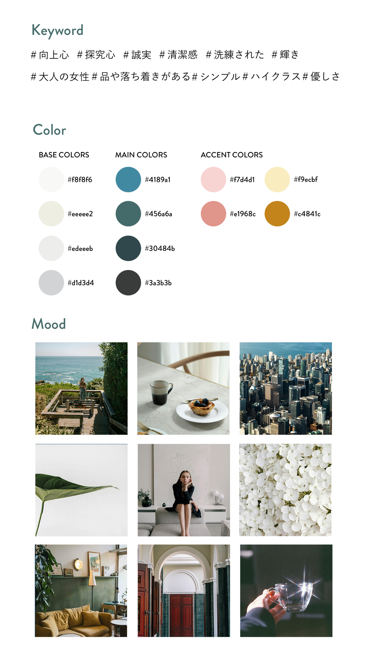 ターゲット層やペルソナから、「洗練」「誠実」「品や落ち着きのある」をテーマに配色を設計しました。