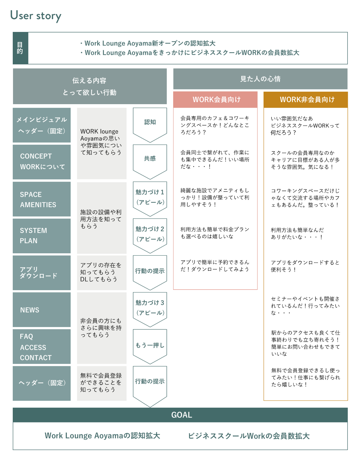 目的としている「コワーキングスペースの認知拡大」「ビジネススクールWorkの会員数拡大」を達成するために、ユーザーにとってほしい行動とプロセスを組み立てました。
