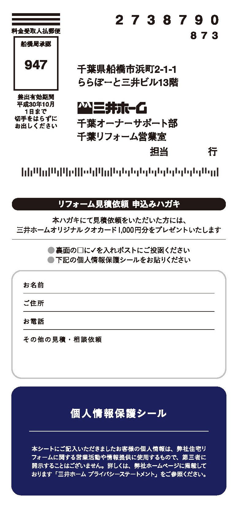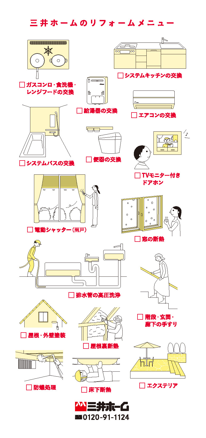 三井ホーム「リフォーム見積依頼申し込みハガキ」デザイン・イラスト制作 本多理美 satomi honda グラフィックデザイナー 千葉・埼玉・関西圏で展開された三井ホームの「リフォーム見積依頼申し込みハガキ」を制作しました。オモテ面のイラストで、どのようなリフォームができるのかパッと見てすぐわかるようになっています。