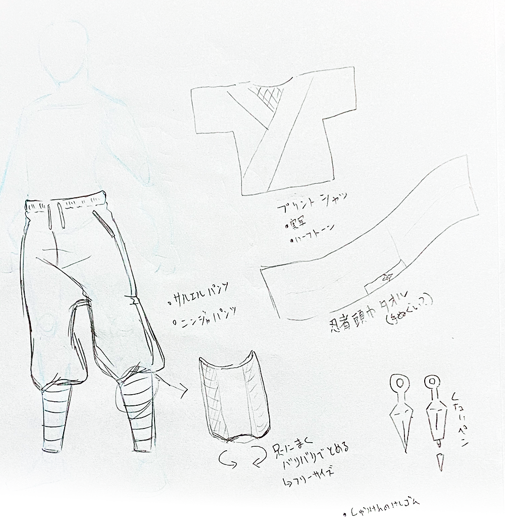 忍者のなりきりセットのデザイン。ちゃんとした忍者服の方が需要があるかもしれないが、手軽に日常に取り込めれば嬉しいと思い、デザインを作成。